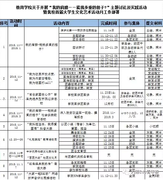 教育学院于2018年11月13日举行了“我的肩膀——能挑多重的担子?”主题讨论及实践活动暨我校首届大学生文化艺术活动月启动仪式。我院党委副书记王利老师、学工办副主任于国佳老师、团总支负责人孙悦老师、辅导员张玉老师出席启动仪式。学院学生会成员、各班班长和团支部书记参加仪式。