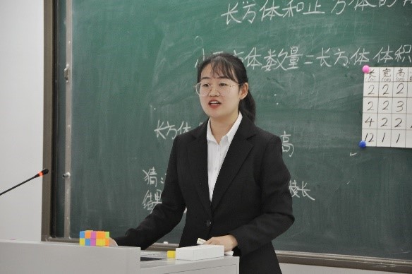 梁世伟老师肯定了数学专业两位同学的学科素养。赞扬田雨同学分数教学中数学文化的融入,马卉坤同学长方体和正方体体积教学过程中对于学生认知心理的把握。同时在总结中谈到,“信息技术高度发展时代,作为小学老师,愈要看到小学教育在人才培养中的基础作用,坚持在教学基本功上下苦功,真正承担起立德树人的使命和担当。”