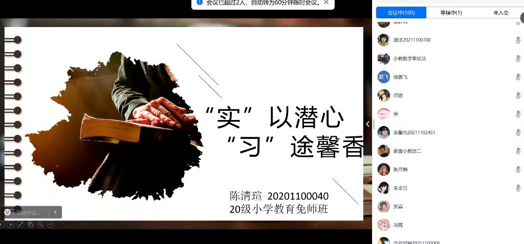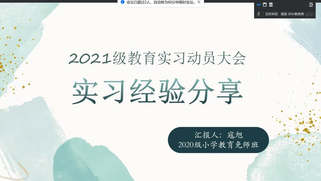上学期刚刚结束实习的20级小学教育免师范班寇旭和陈清瑄两位同学分别就她们在区内和北京实习的经历进行了深入细致的经验分享。寇旭同学认为充分准备、积极沟通、善于思考对实习至关重。同时在工作中同学们既要切实担负起小学生的安全责任,也要明确自己的职责范围,听从校方及指导老师的安排。陈清瑄同学则提醒同学们反思总结应当与实习同步进行,切勿拖延。同时指出真诚是人际交往的法宝。