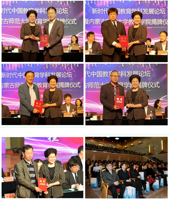 黄雅丽为北京大学教育学院院长阎凤桥、北京师范大学教育学部副部长李芒、中央民族大学教育学院党委书记苏德毕力格、北京师范大学博士后发展研究与评估中心主任姚云、海南师范大学教育科学研究院院长李振玉颁发兼职教授聘书。