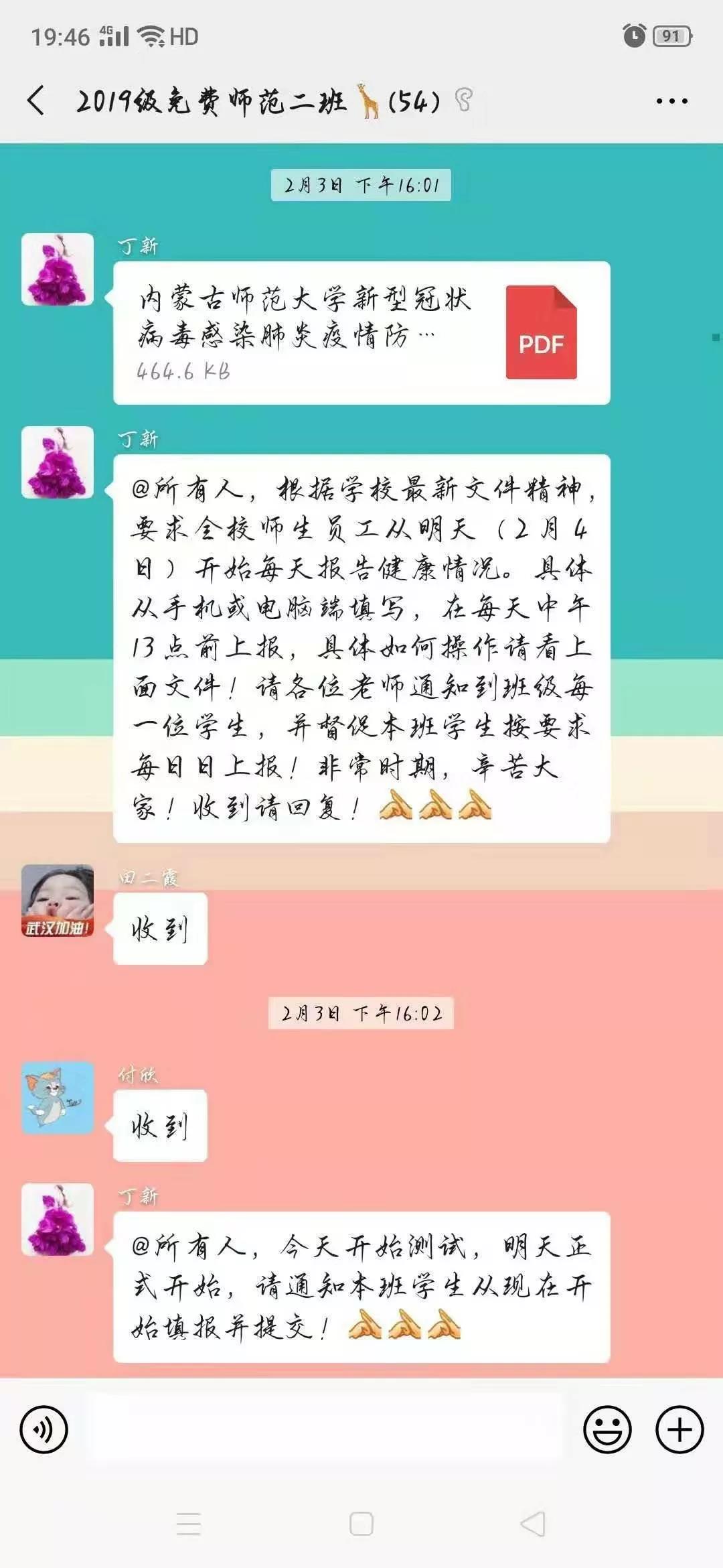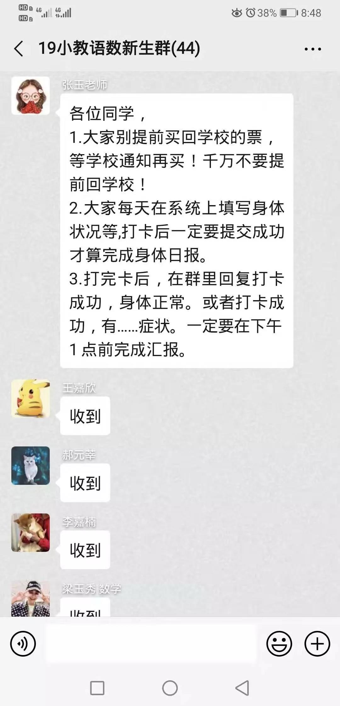 2020年在一场战“疫”中拉开帷幕,武汉成了全国乃至全球人最关注的一座城市,抗击疫情,刻不容缓。为贯彻落实自治区防疫最新要求和学校最新文件精神,切实做好防疫工作,教育学院认真执行“每日一报”打卡制度,全体师生按时填写提交“健康状况日报”,准确做好信息统计和信息上报工作,齐心协力防疫抗疫,以实际行动表明坚决打赢这场战争的决心,充分体现了我院对疫情防控工作的高度重视。