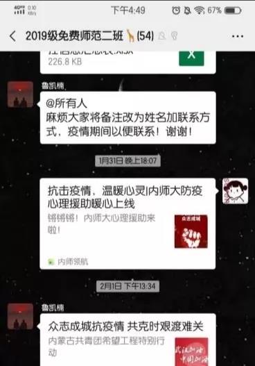 在这共克时艰的特殊时期,教育学院各班心理委员牢记自己的责任和使命,密切关注同学们的心理动态,积极对同学们进行心理辅导,转发心理疏导的相关文章,极大地缓解了同学们焦虑不安的心情。