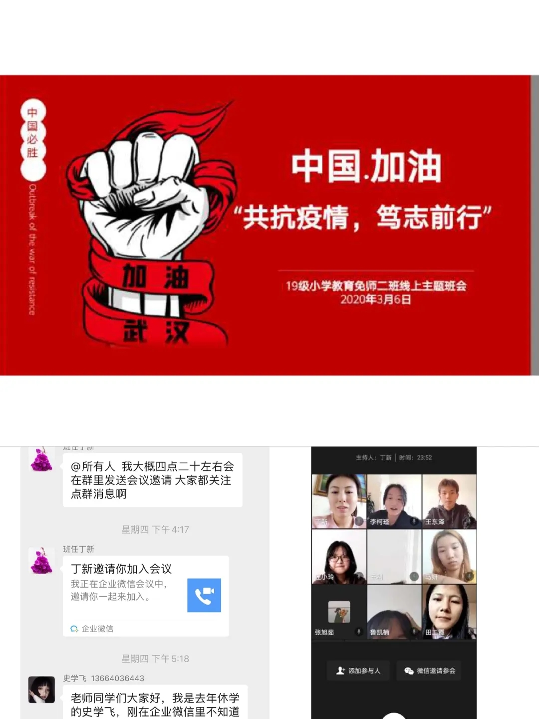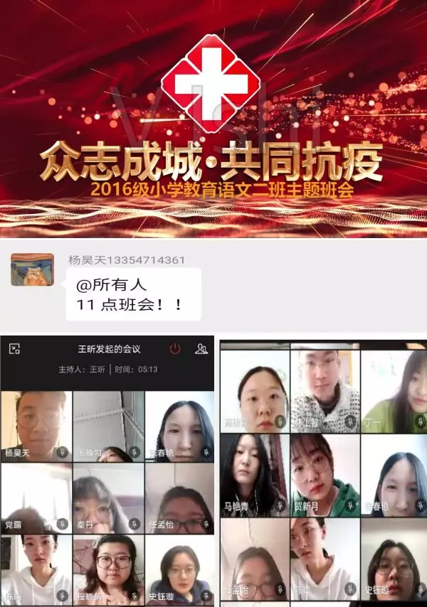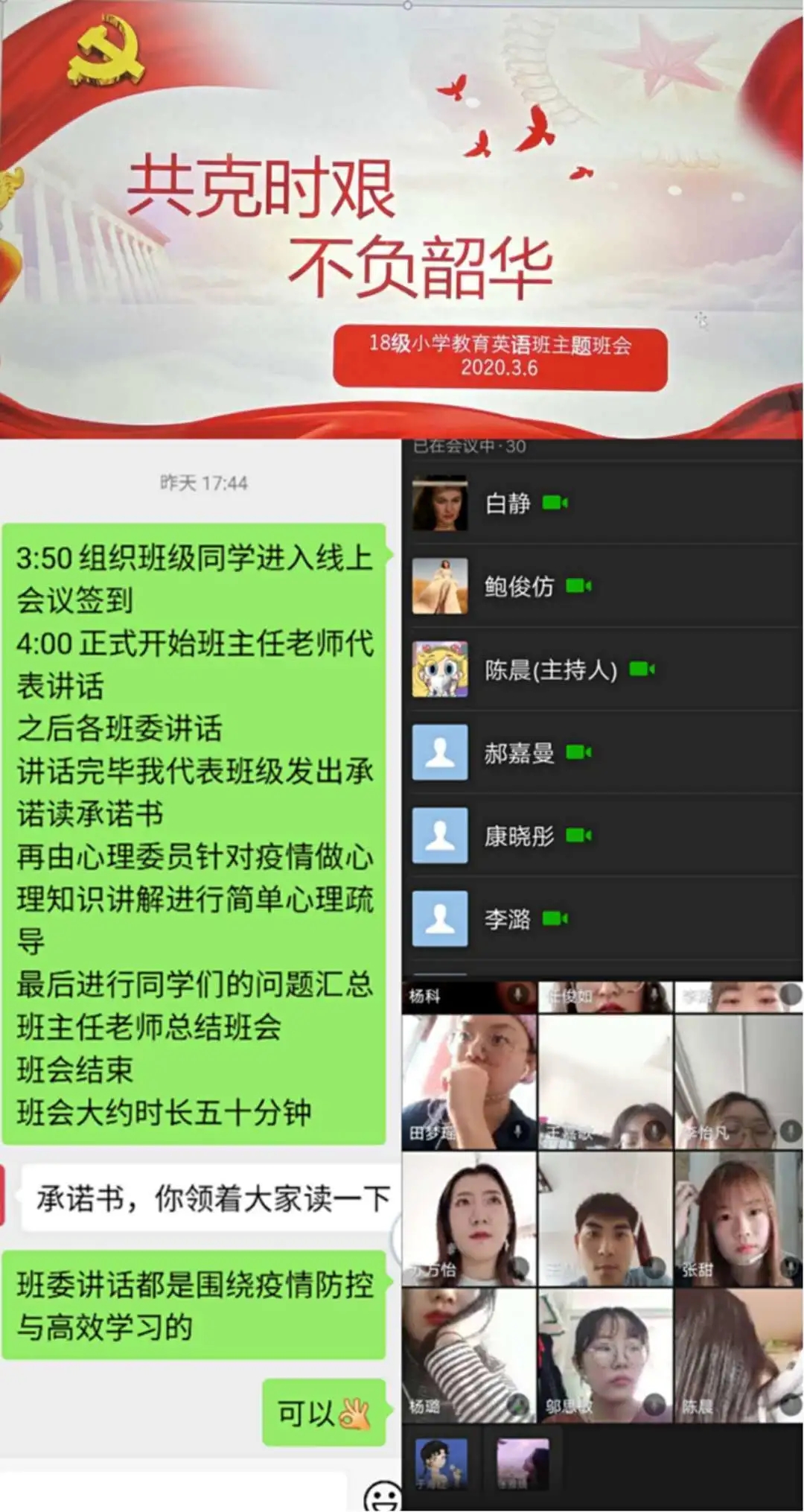 为深入贯彻落实习近平总书记关于打赢疫情防控阻击战重要指示批示精神,保障防控疫情期间“停课不停学”,充分发挥网络育人功能,根据自治区和学校有关工作部署,教育学院各班级组织召开“共抗疫情,笃志前行”为主题的疫情防控线上班会。
