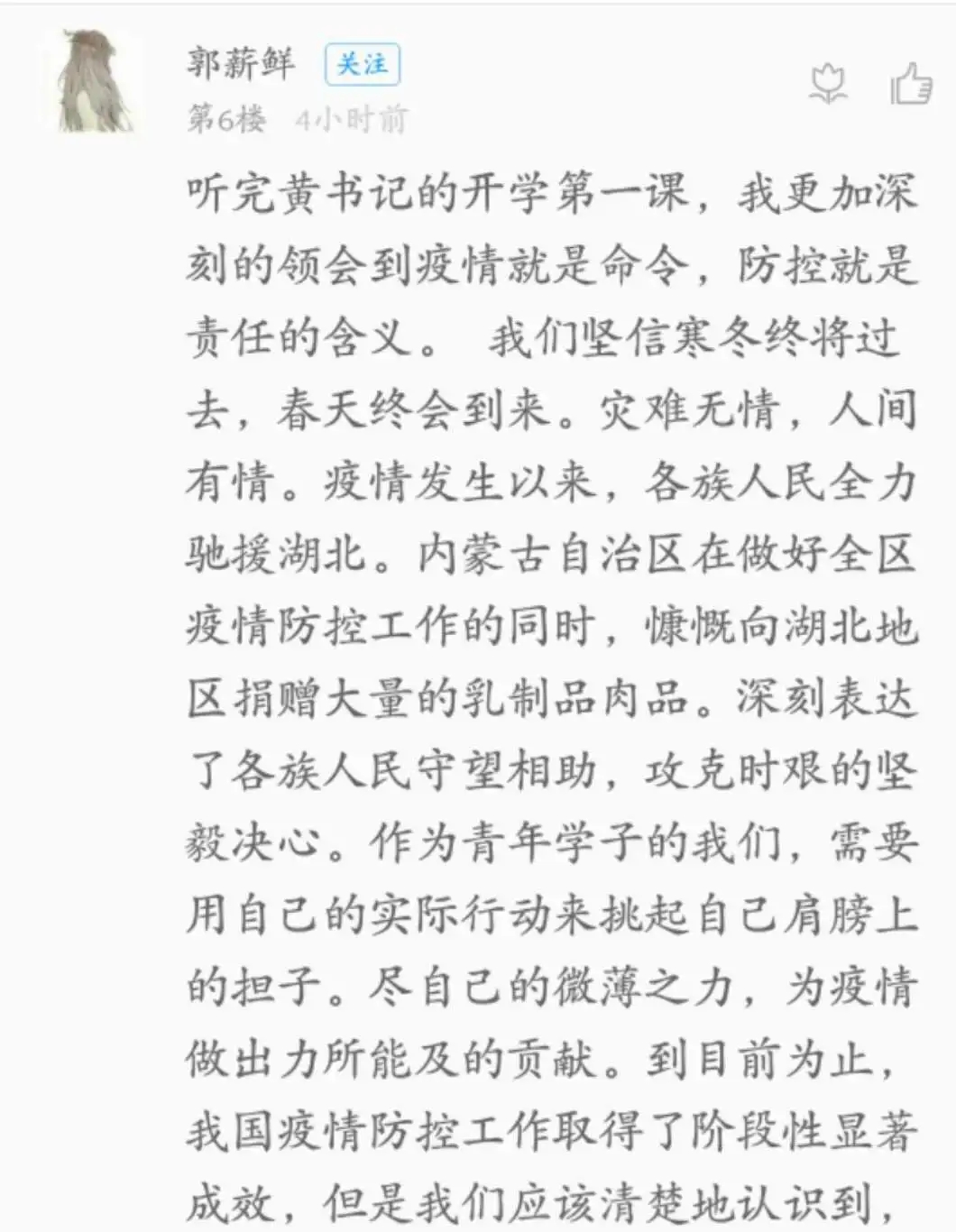 3月9日上午8点,内蒙古师范大学党委书记黄雅丽在内师领航微信公众号上以线上讲课的方式为我们讲述《开学第一课》。“一方有难,八方支援”,在危机面前,中国人民从未妥协,就算疫情隔离了我们身体上的距离,也不能疏远彼此之间心的距离。疫情期间在家不能出门,也不能返校,那我们就用线上学习的方式上课,一起满怀激情地讨论问题。我们能看到亲爱的老师们为线上教学做出的努力尝试,看到同学们积极遵守课堂秩序,准时签到,认真上课。我们正以自己最积极的状态,抗击疫情。就像党委书记黄雅丽说的“没有一个冬天不可逾越,没有一个春天不会到来”,我们的校园正静候着我们回归。