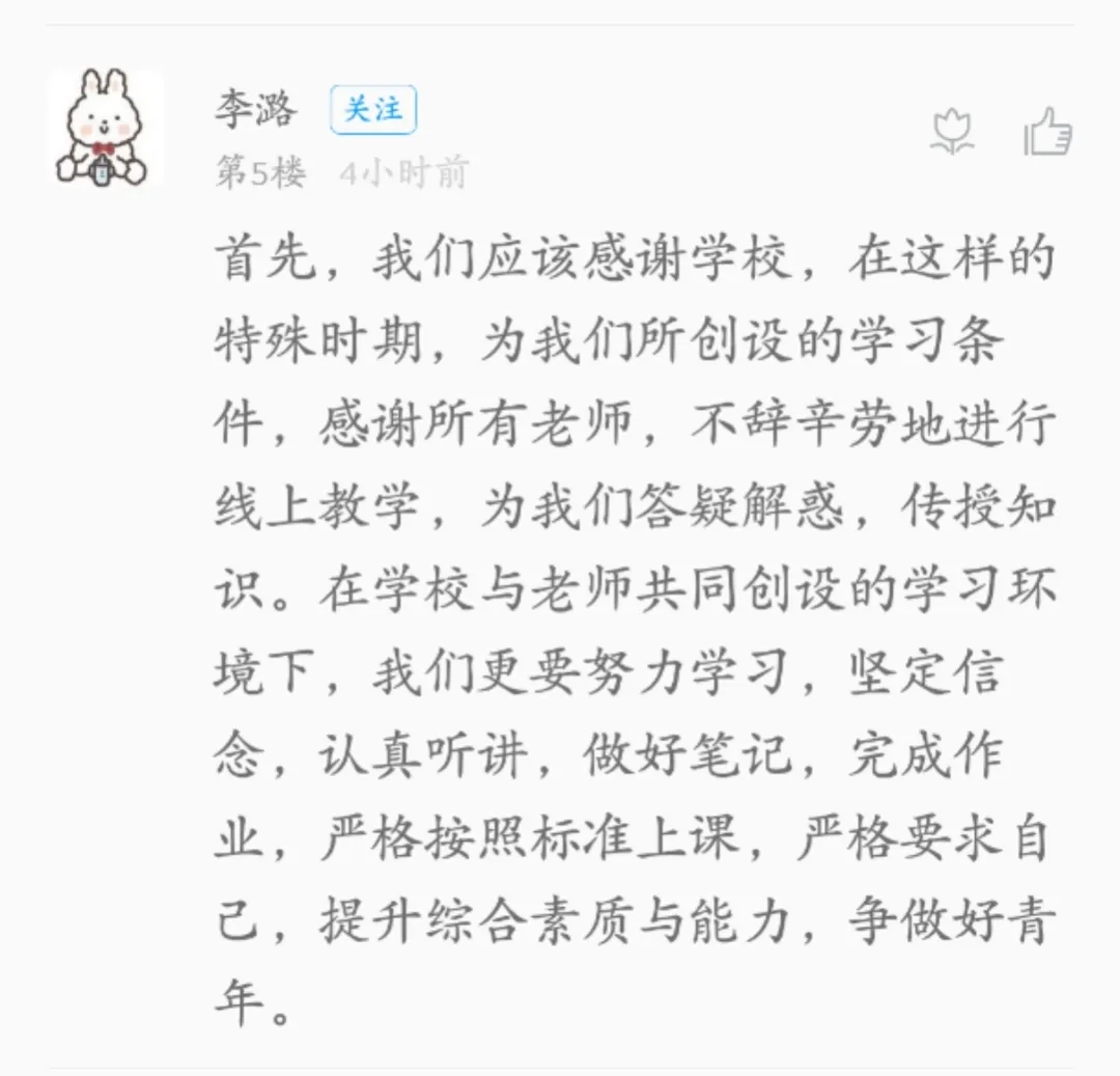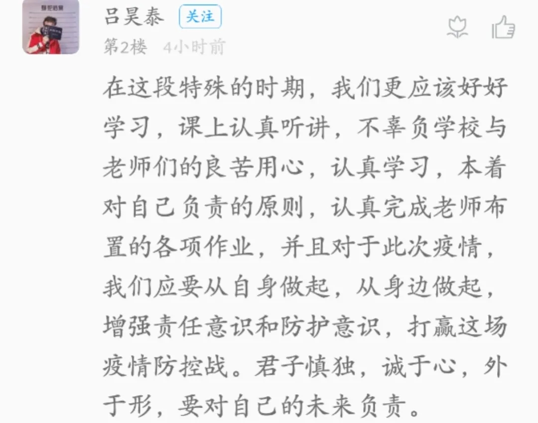 这是一次特殊的开学,一样的老师同学,不一样的开学“配方”,不一样的欢聚;一样的讲授互动,不一样的交流平台,不一样的火花。黄雅丽书记在讲话中以“同心战疫,砥砺成长”为主题,讲述了有关疫情的措施、安排,为学生的网络授课和就业实习做出指导,并对所有同学提出六个希望,让我们真切感受到学校的负责,如校训一般,真正的“献身,求实,团结,奋进”。正式开学后,我们会端正心态,认真对待网课,寻找到它的意义与价值;我们也会努力完成六个希望,真正做到心怀感恩、勇于担当、善于思考、心存敬畏、保持理性、体悟亲情。众志成城,共克时艰,希望疫情可以早些过去,我们可以在师大校园相约,听书声袅袅,看云卷云舒,赏春光无限,盼明日朝阳。