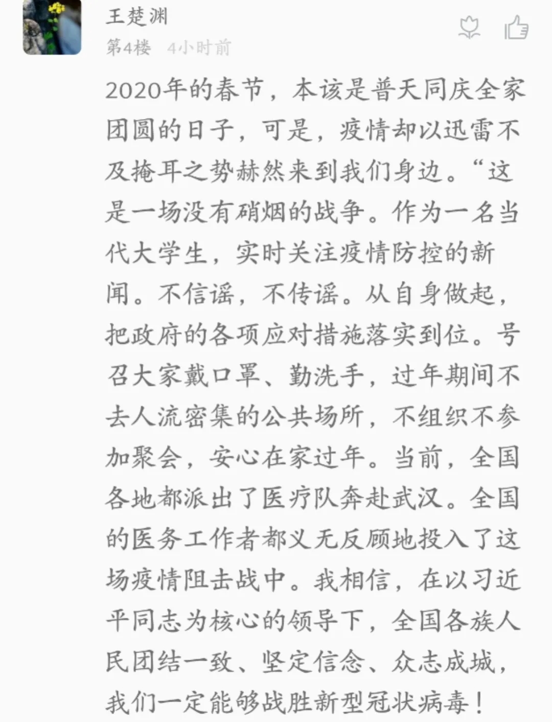今天,我们又以特殊的方式——网上收看了黄雅丽书记的《开学第一课》。黄书记的讲话让我回想起《孟子》中的话:“生于忧患,死于安乐”,其实不论是国家还是个人都是一样的,作为一个国家,中国以令其他国家望其颈背的能力处理好这场攻坚战。那么身为中国人,身为中国青年的我们更应该传扬国家的精神。“士不可以不弘毅,任重而道远”,这是我们祖先就曾告诉我们的道理。如今当是少年破敌时,是国家需要我们的时候,也是我们自己走向未来的重要时刻。