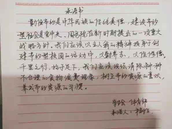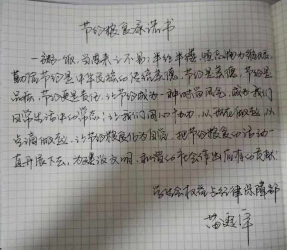 犹记锄禾日当午,最累汗滴禾下土,一粒粮食一分苦,该当珍惜心有数,粮食是地球赐给我们有限的礼物,爱护粮食就是珍惜生命之源,从同学们的一份份承诺中我们可以看到他们对于粮食的重视,也希望每一个人都可以拿出实际行动,为党为国家分忧,把爱惜粮食、节约粮食的活动扎扎实实地开展下去。