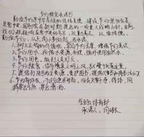 米饭粒粒念汗水,不惜粮食当自悔。谁也不会忘记祖祖辈辈用汗水演绎何处黄土不埋人的壮烈,而如今丰衣足食的我们也绝不能够抛弃艰苦朴素的美德,铺张浪费,为了进一步贯彻落实习近平总书记关于制止餐饮浪费的重要指示精神,教育学院同学们作出以下承诺: