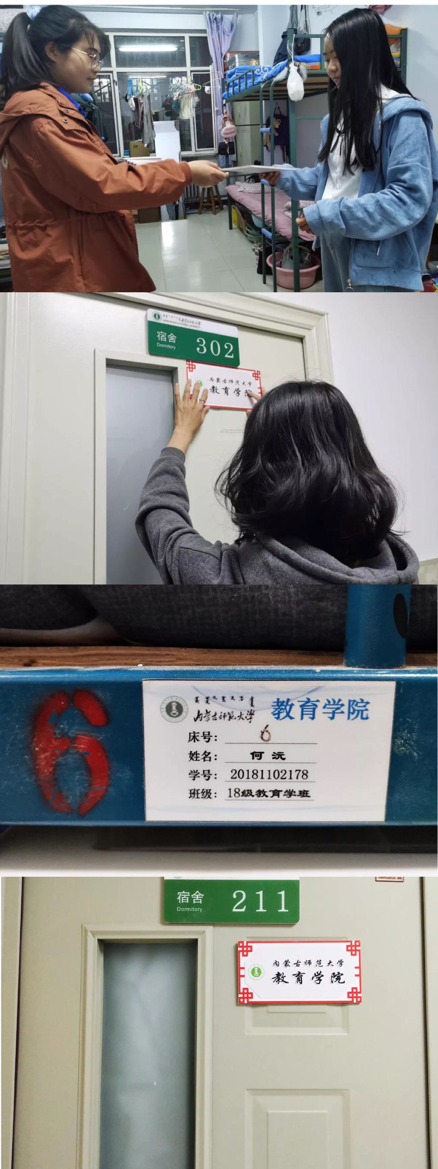学生宿舍是学生学习、生活、休息的重要场所,是校园文明建设、培养良好校风和学风的重要阵地。我院为将学生宿舍打造为标准规范且不失学院特色的“学生之家”,特为学生宿舍以及每位同学发放了充满学院特色的门牌和床卡。并且对学生的宿舍内务进行了严格检查,力求建设标准化学生宿舍。