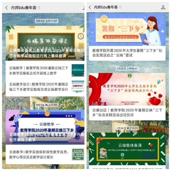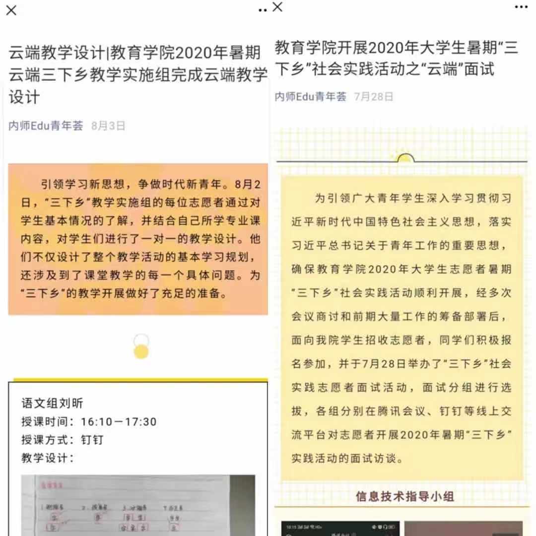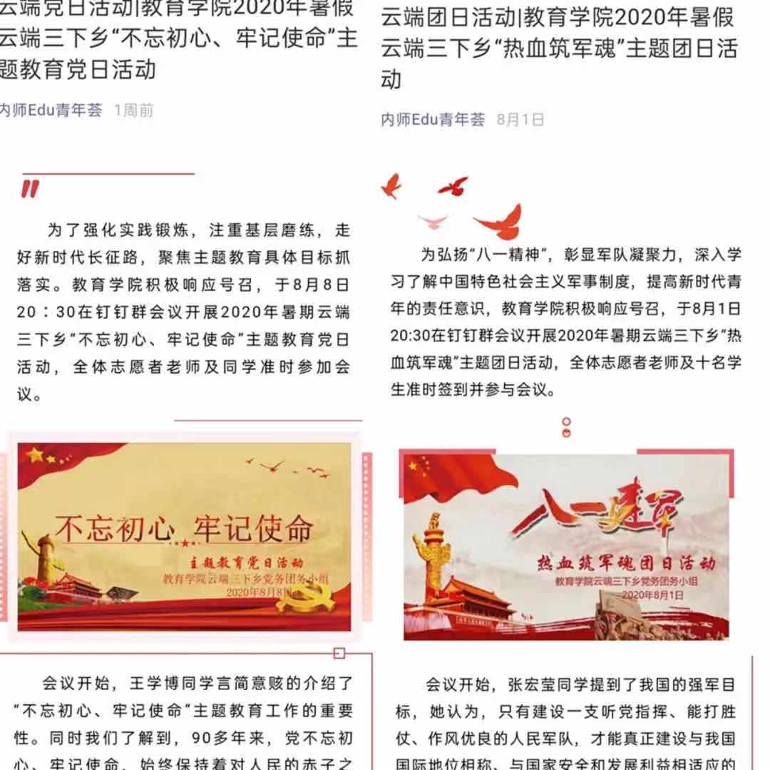 关于教育学院2020年的暑期云端三下乡活动,作为宣传报道组的成员,主要负责此次活动的宣传工作,收集、整合三下乡活动期间志愿者老师的教学工作和党团活动,并图文整合做成推送。这半个月以来,顺利出了5个推送,虽然不多,但受益匪浅。