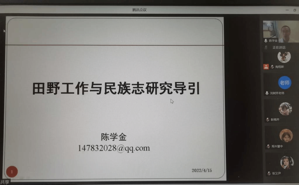2022年4月15日,我院邀请北京市社会科学院社会研究所副研究员陈学金博士作题为《田野工作与民族志研究导引》的学术讲座。陈学金博士对民族志的内涵、特征、不同学科民族志研究的异同、民族志和田野工作之间的关系进行探讨,在并结合三案例,围绕田野工作开展的方式方法、研究问题的凝练、文本的架构、理论的探讨与分析等多方面内容进行了深入阐述。讲座由教育学院陶格斯博士主持,本校民族教育学、课程与教学论等专业的研究生和本科生及校外师生参加。提问与交流环节中,陈学金博士推荐了人类学方法论的书籍,并分享了读书、写文章的方法与经验。