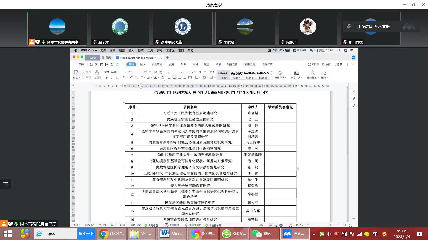 2023年1月4日下午3点,学院学术委员会通过腾讯会议召开内蒙古民族教育研究基地拟立科研项目评议会。教育学院党委书记周越、院长米俊魁、副院长边琦、斯日古楞教授、杨晓敏教授、叶琳教授、陶格斯副教授以及阿木古楞博士参加了本次会议。会议由赵荣辉副院长主持。