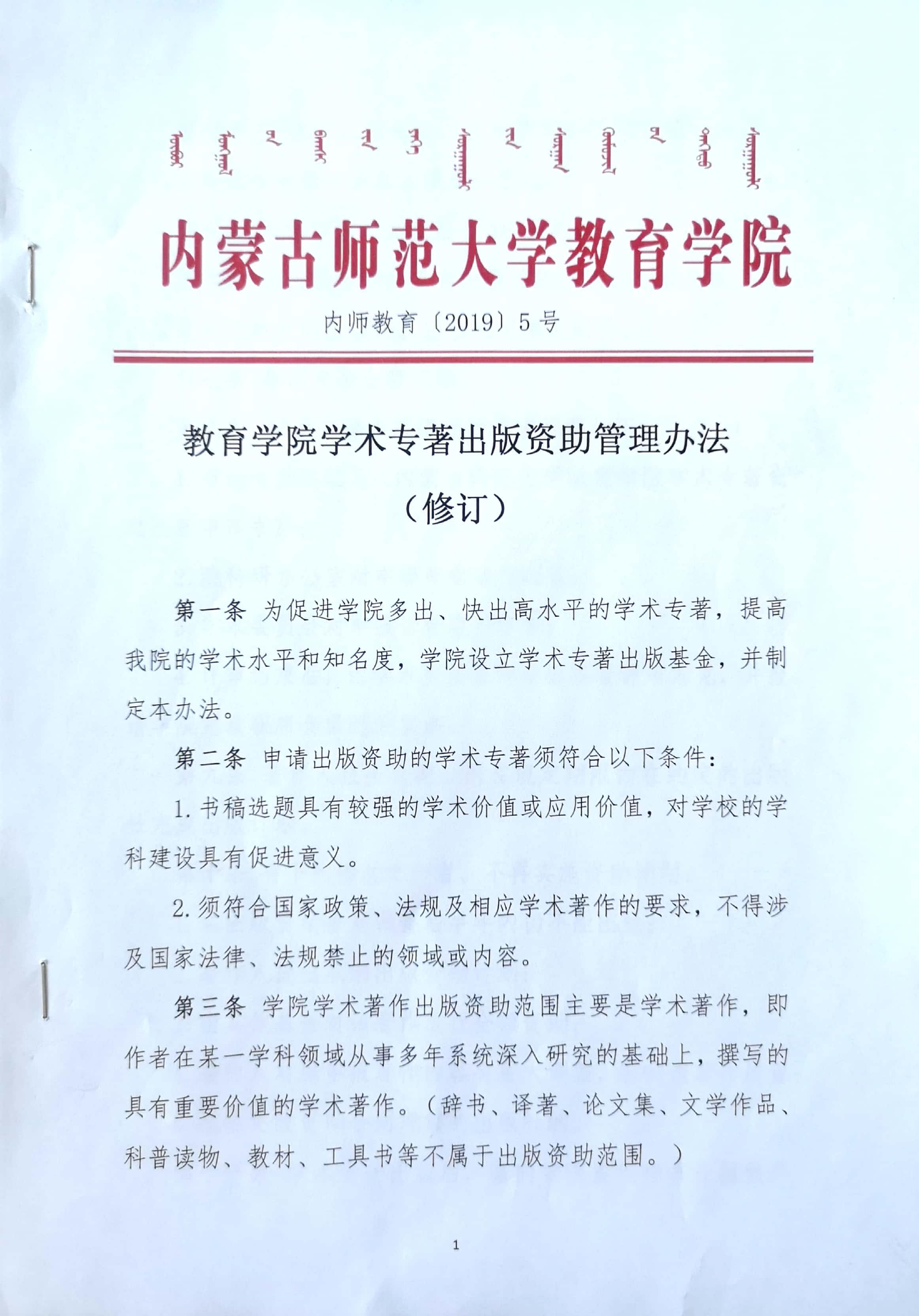 教育学院学术专著出版资助管理办法(试行)(2019)2号